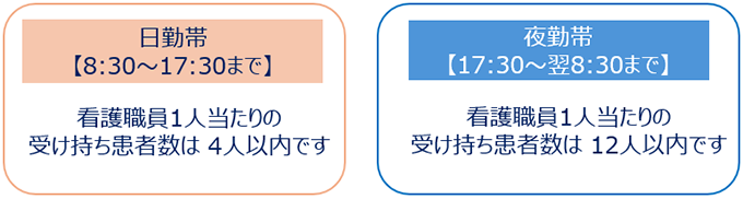 1日に12人以上の看護職員および6人以上の看護補助者が勤務しています。勤務時間ごとの配置は以下の通りです。