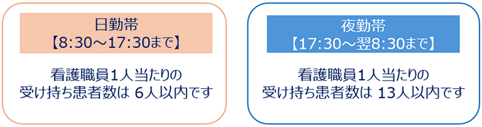 1日に14人以上の看護職員および5人以上の看護補助者が勤務しています。勤務時間ごとの配置は以下の通りです。