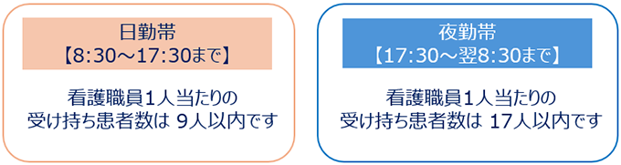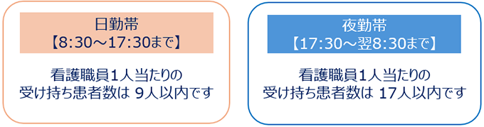 1日に9人以上の看護職員が勤務しています。勤務時間ごとの配置は以下の通りです。